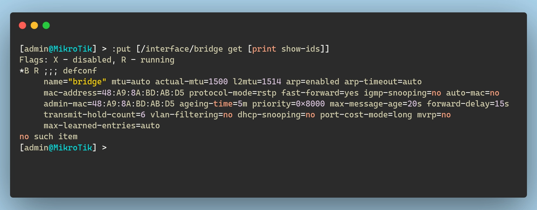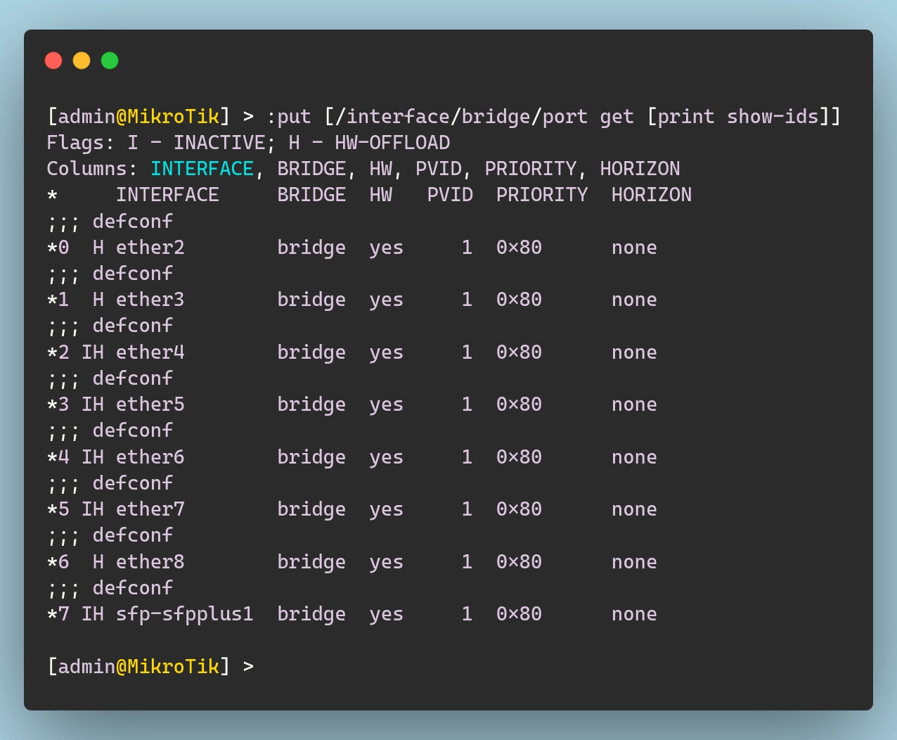 Since my RB5009 has only one switch chip, it has one default bridge called… well… bridge