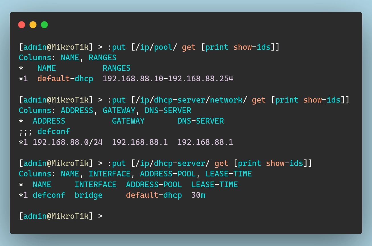Mikrotik routers come pre-configured with a DHCP server on the LAN network so that devices connecting to them automatically receive an IP address. This setup is composed of three elements: