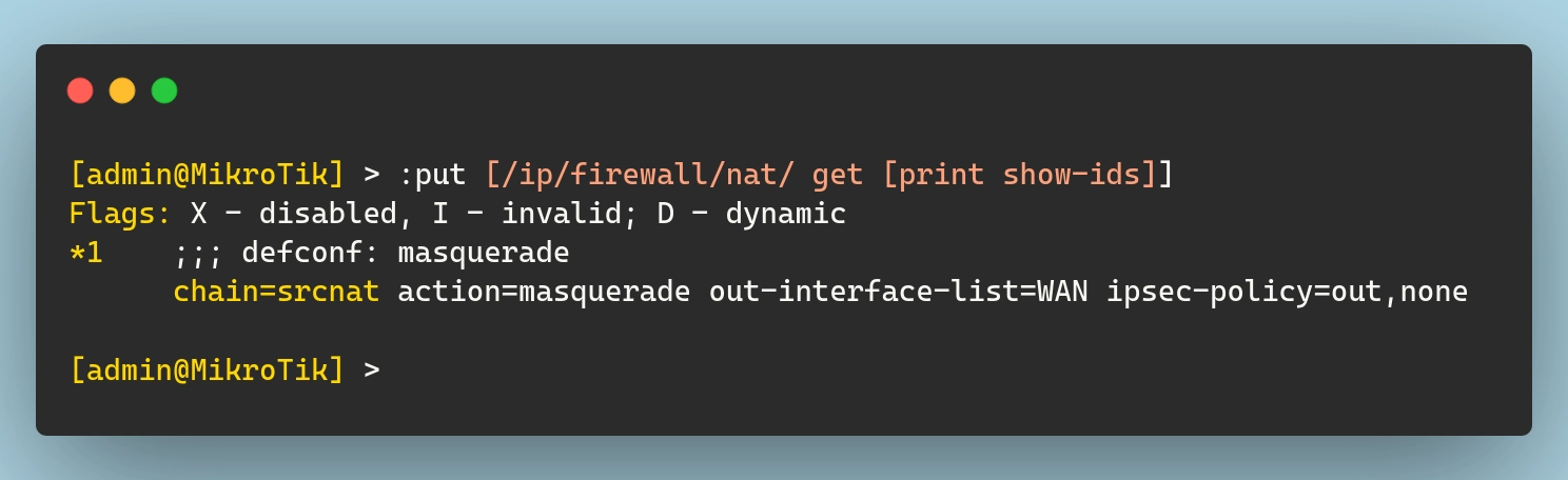 Mikrotik routers use NAT (Network Address Translation) to allow devices on the internal network (LAN) to access the internet through the WAN interface. This is done using a masquerade rule, which dynamically translates private IP addresses into the router’s public IP: