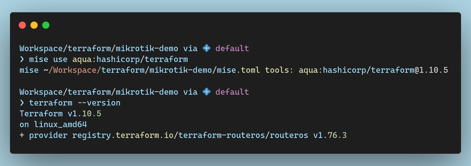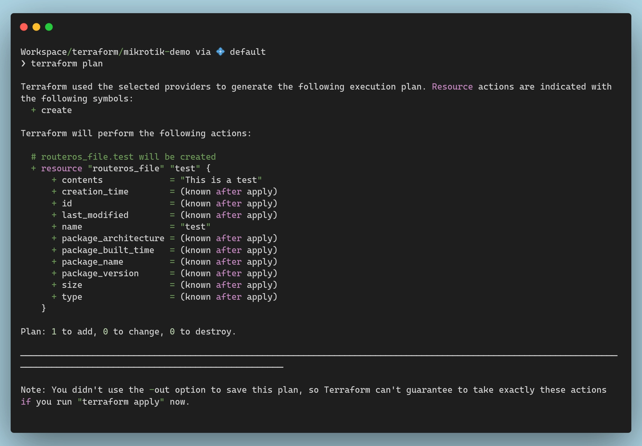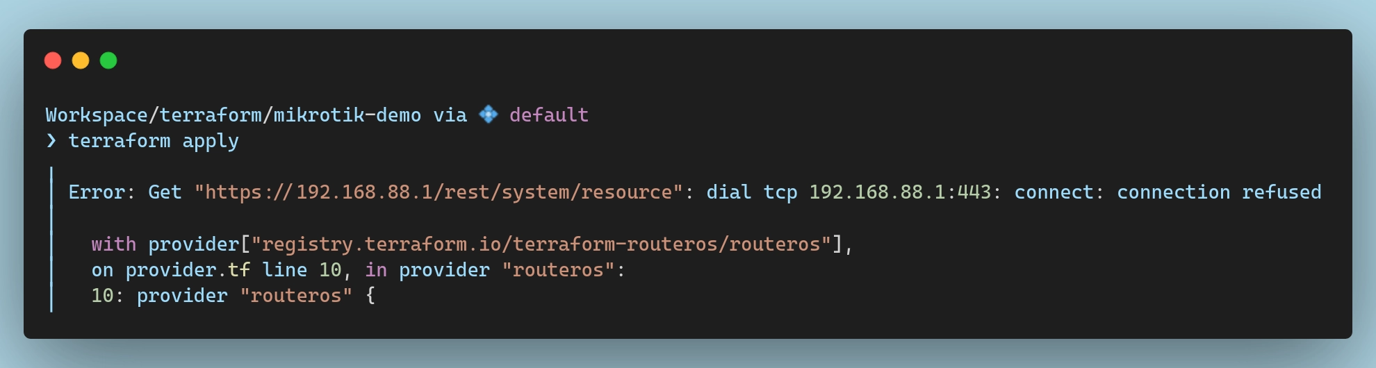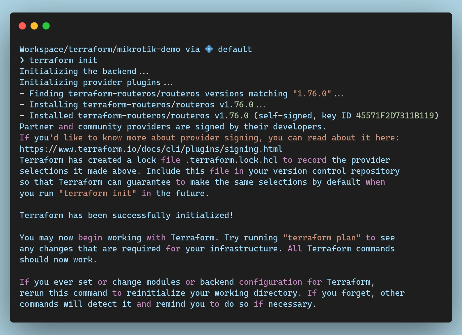 If you see output similar to the above, then it means terraform has successfully connected to your Mikrotik device, and you’re ready to move on to the next steps!